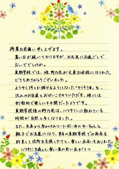 暑い中、3~4歳のお子様連れの参加は、少々きついものがあると思うのですが、皆様けっこう遠くからいらしておいででした。 このような手紙を頂くと、音楽を通した繋がりが子供の世界を広げてくれるようで、改めて、鈴木先生の蒔いた種が広がって、それが受け継がれていることを実感します。 この方、お母様もスズキのOGだと、グループレッスン会場でお目にかかった彼女の先生に伺いました。