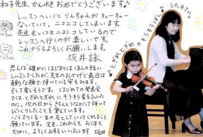 Uちゃんのレッスンはじめ、1分ももたなかったですよね! 集中力が切れると、とたんに注意散漫、寝転んでしまったこともあったような、、 そんなレッスンが半年くらい続いた気がします。いつだったかUちゃんのお母様から「これで大丈夫でしょうか?」と言われたように思います。 ここで無理に長く練習させるのはダメなのですよ。いつまでたっても集中力が育ちません。初めは、ほんの10秒でも、、 あれから7~8年? 素敵な演奏をするお嬢さんになりました。ま、今でも練習時間はさほど長くないようですが、、 それでも集中力が育っていれば、それは他の分野にも生きてくると思います。